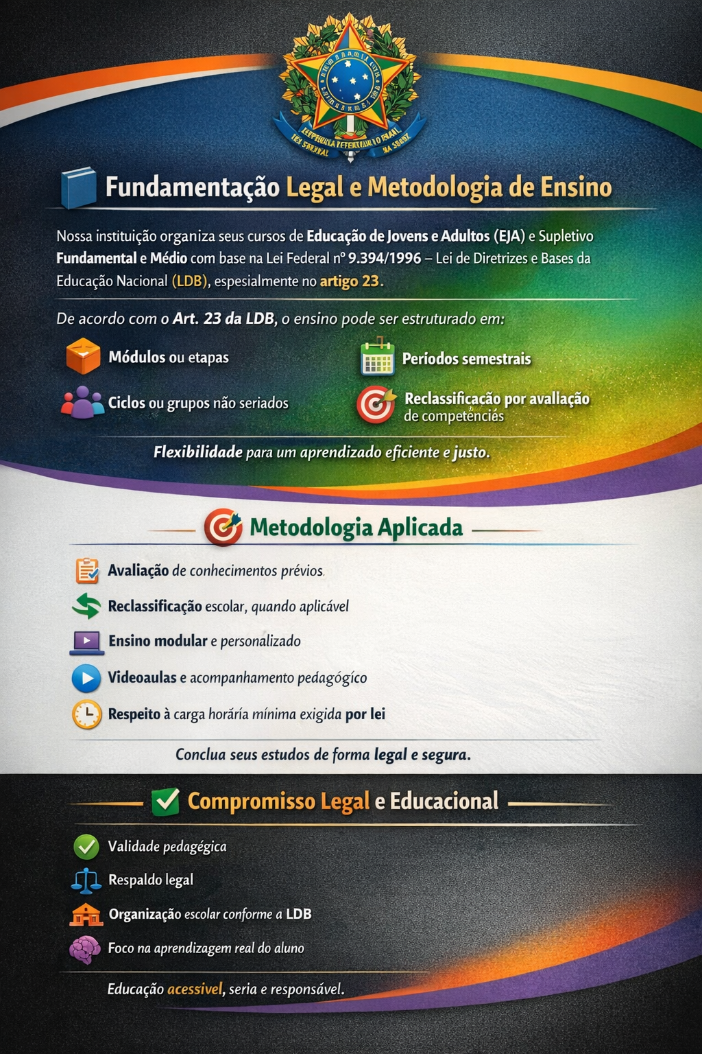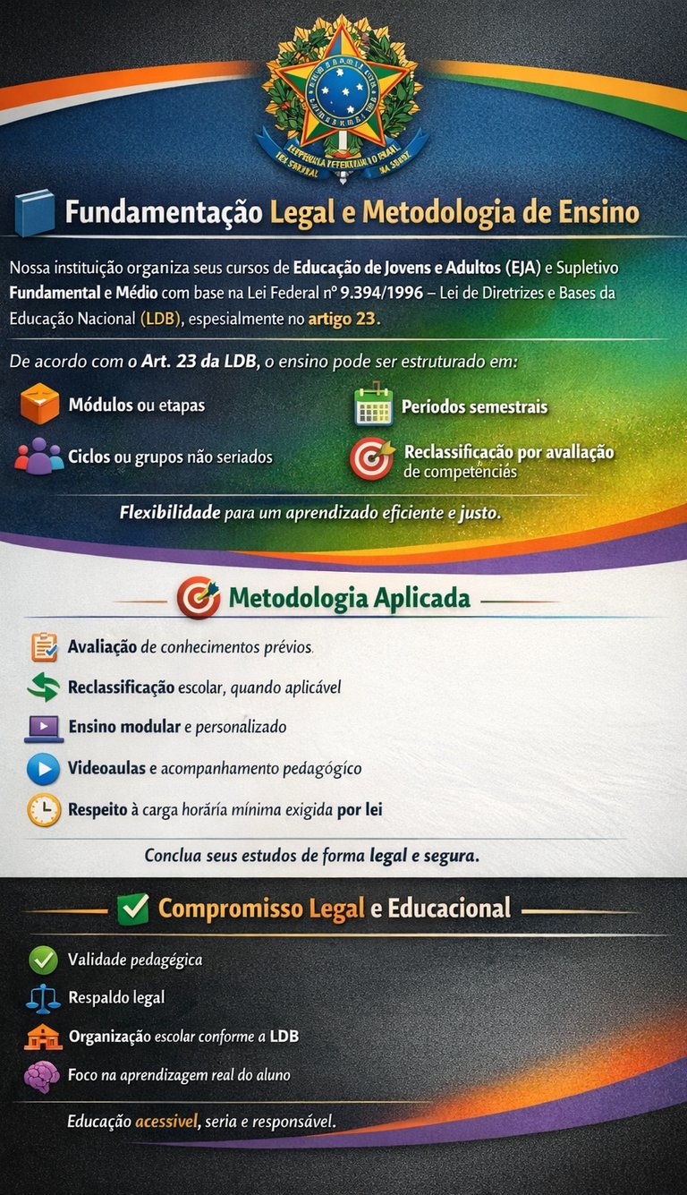 Oferecemos ensino fundamental e médio EAD com validade em todo território nacional, reconhecida através da Lei Federal 9394/96, de classificação do EJA-Supletivo (Educação de jovens e adultos).