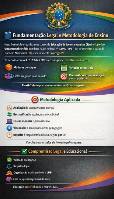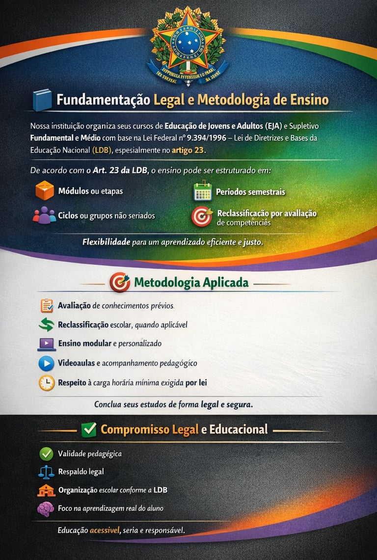 Oferecemos ensino fundamental e médio EAD com validade em todo território nacional, reconhecida através da Lei Federal 9394/96, de classificação do EJA-Supletivo (Educação de jovens e adultos).